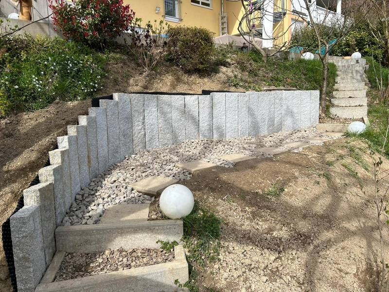 Höhenunterschiede, Abgrenzungen oder Treppen: Wir setzen L-Steine, Stelen, Blockstufen oder Natursteinmauern fachgerecht und dauerhaft. Ob als Stützmauer oder Gestaltungselement – die Ausführung ist immer solide, ordentlich und dem Gelände angepasst.